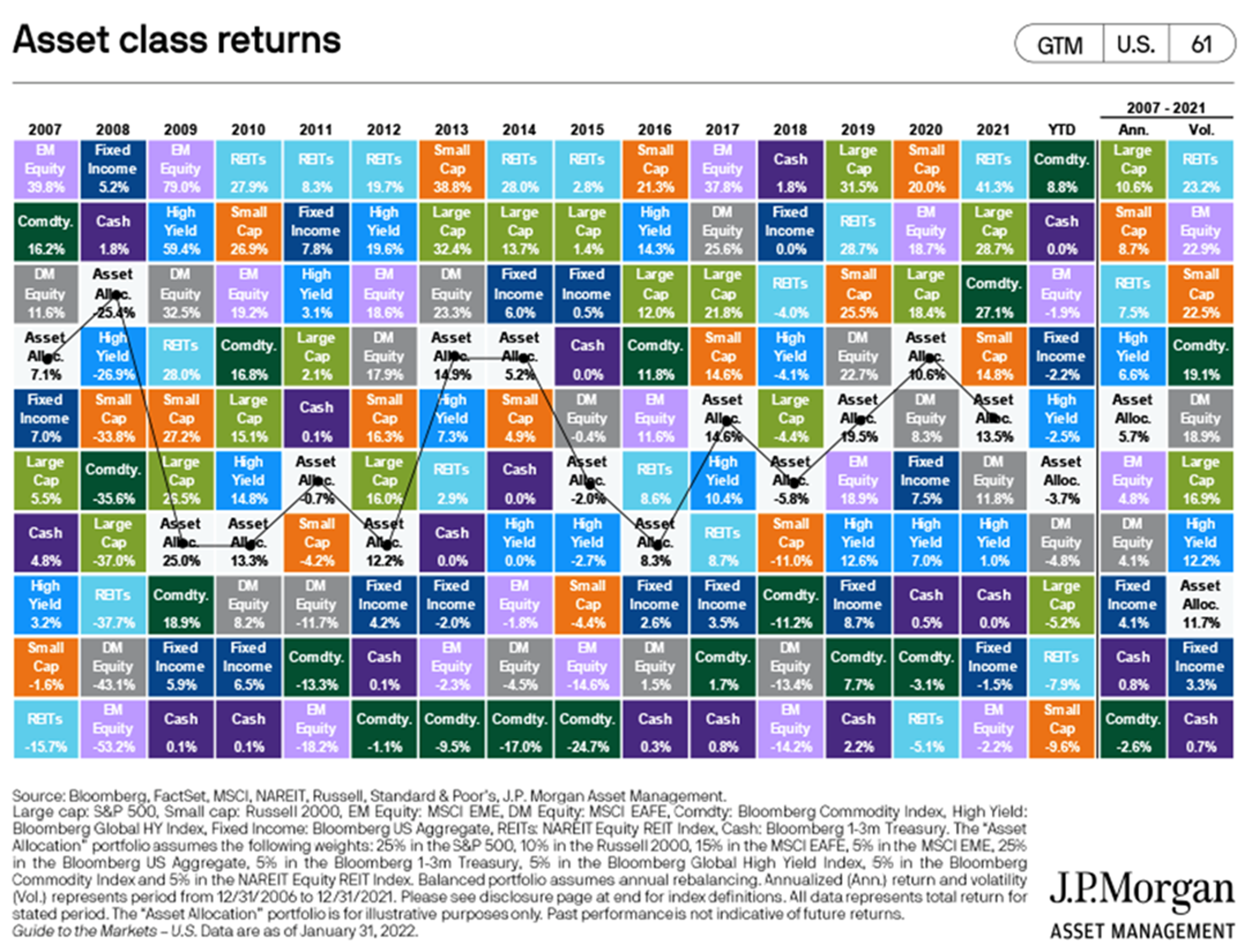 According to the above, picking a random year, in 2013 anyone who over-weighted small-caps did far better than those who decided to bet on emerging markets. In fact, pick your year, and you can see which asset classes did well that year and which asset classes did poorly. If you over-weight the top of the chart, you do well; if you over-weight the bottom, you do less well. No one knows which asset class will be on top next year.