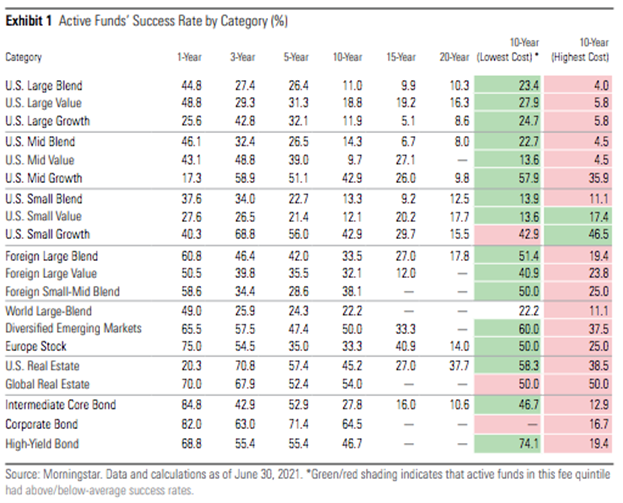 You may or may not “outperform” in the short run… we can’t predict. On average, in the US, less than half of managers outperform over one year. Internationally and in fixed income, the averages for outperformance are higher over a single year (this may even be tempting you as you read).